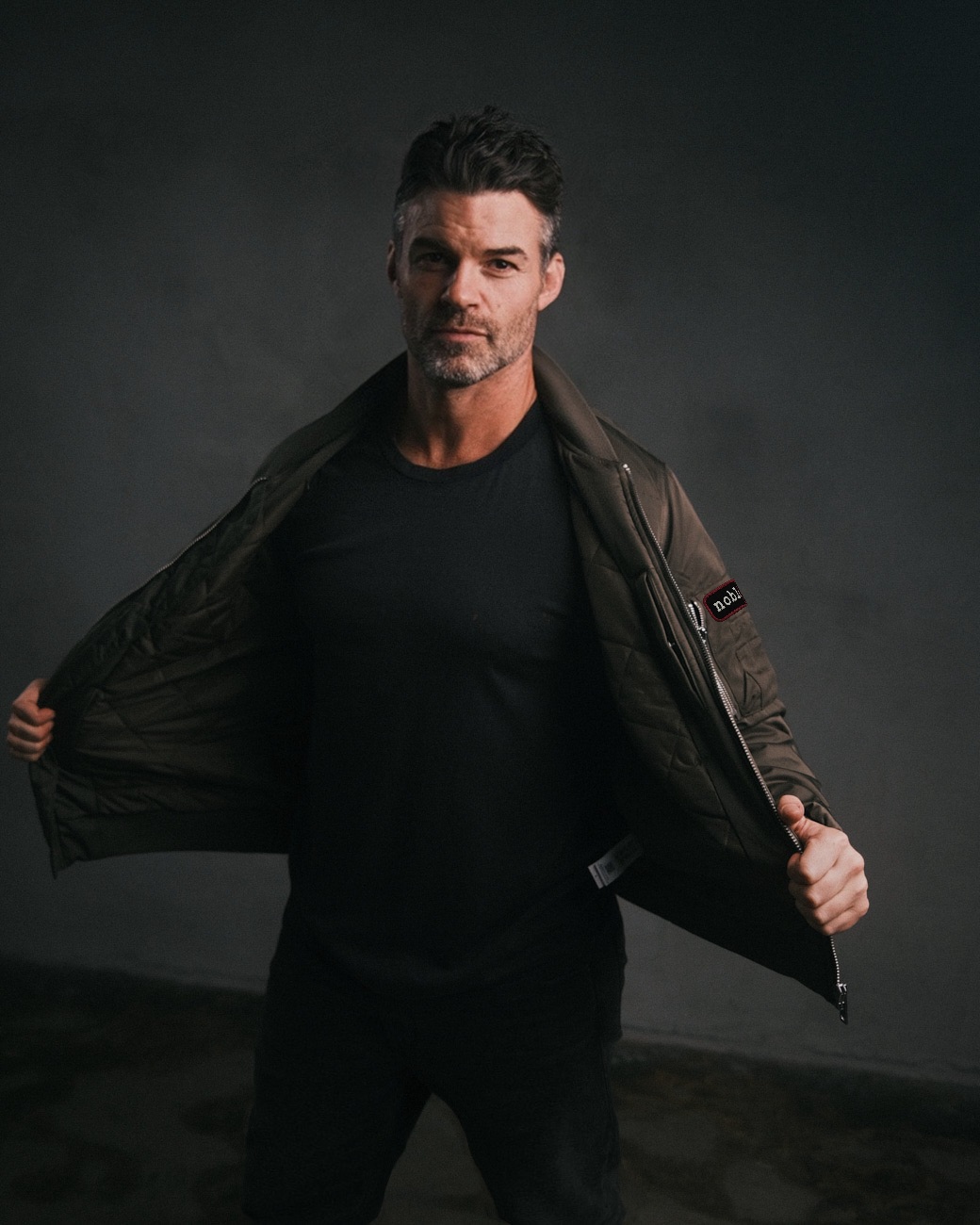 An olive bomber jacket designed with Daniel Gillies and inspired by his most iconic role.